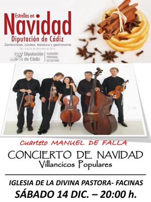 Por otro lado, la Navidad también será la referencia mañana sábado en Facinas. A través del programa “Estrellas en Navidad” de la Diputación de Cádiz, llegará a la entidad local, el cuarteto Manuel de Falla. Ofrecerán un concierto de Navidad basado en un repertorio de villancicos populares. La cita es a partir de las 20:00 horas en la iglesia Divina Pastora de Facinas.